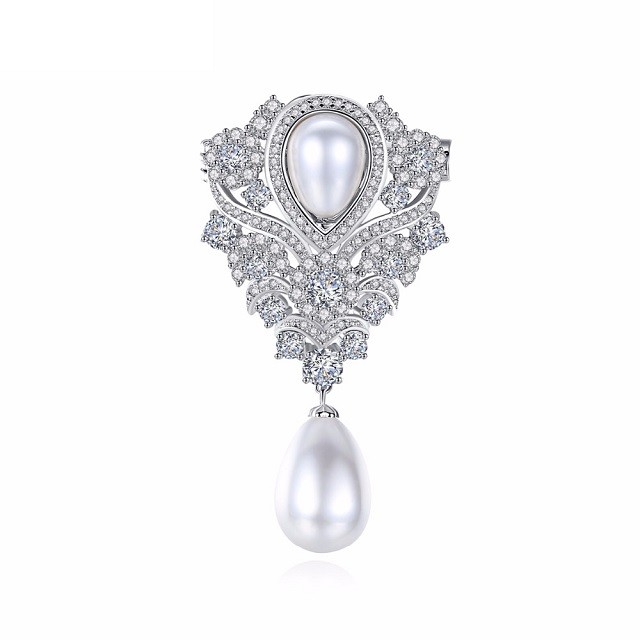 Brose elegante cu design regal placata aur alb 18K Decorata cu Swarovski Crystaks si perle venetiene ivory Dimensiuni brosa: 4.8 cm x 2.8 cm Greutate brosa: 8 grame Brosa nu contine nichel si plumb pentru a nu provoca alergii sau iritatii pielii. Produsul va fi livrat in cutie de bijuterii oferita GRATUIT si va fi insotit de CERTIFICAT DE GARANTIE.